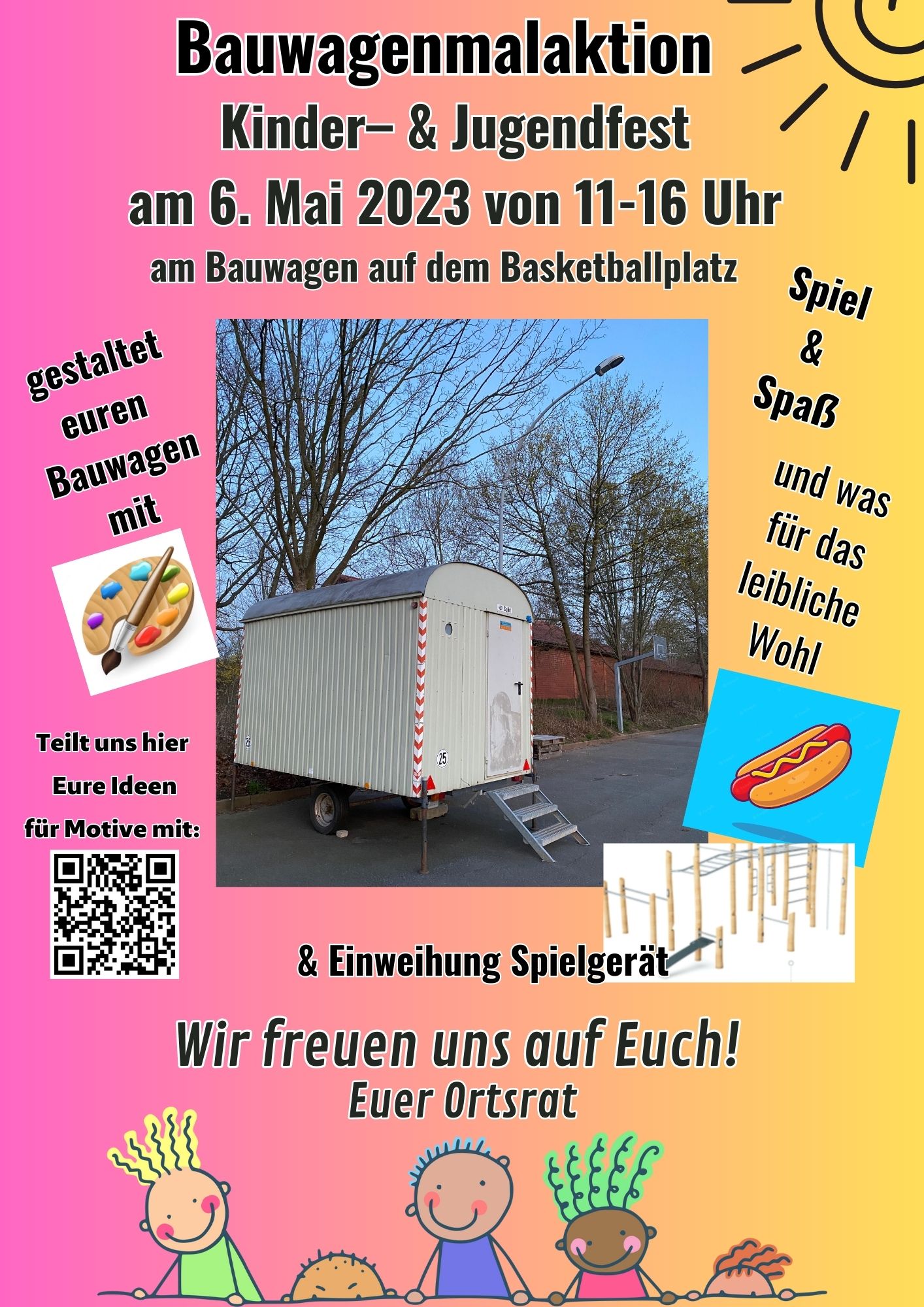 Am 06.05.2023 von 11.00 – 16.00 Uhr auf dem Basketballplatz am Schützenhaus findet ein bunter Vormittag mit Bauwagenmalaktion und anderen tollen Aktivitäten statt.