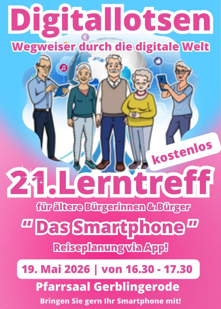 Beim nächsten Lerntreff am 19.05.2026 wieder im Pfarrsaal in Gerblingerode von 16.30 – 17.30 Uhr geht es um die Reiseplanung via App! Das Angebot ist kostenlos!