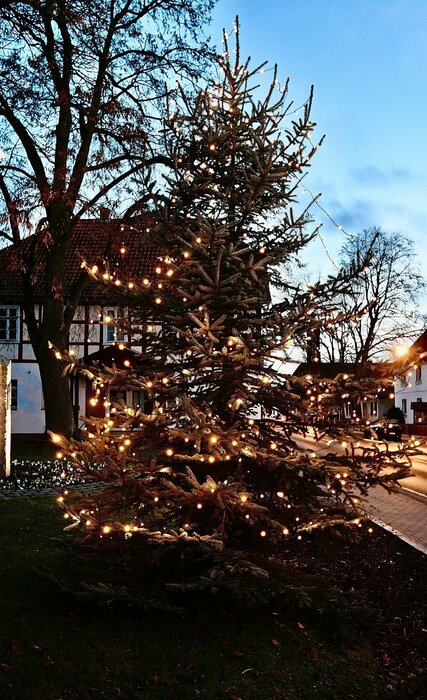 Auf dem Dorfplatz neben der Mehrzweckhalle erstrahlt seit Ende November ein Weihnachtsbaum, erleuchtet von einer Lichterkette. Wie jedes Jahr hatte ihn das Ehrenamts-Team des Ortsteils aufgestellt. Geschmückt wird er erst am Sonnabendmorgen: Christbaumkugeln, Sterne, Lebkuchenmännchen und Zuckerstangen hat Marion Thriene-Wüstefeld, die Ehefrau von Ortsbürgermeister Christian Wüstefeld gebastelt.