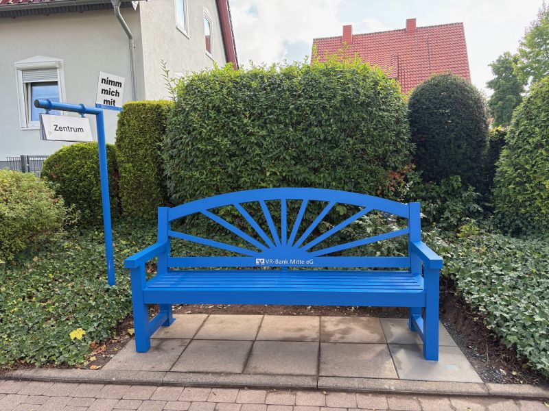 VR-Bank-Mitte spendiert neue blaue Mitfahrbank