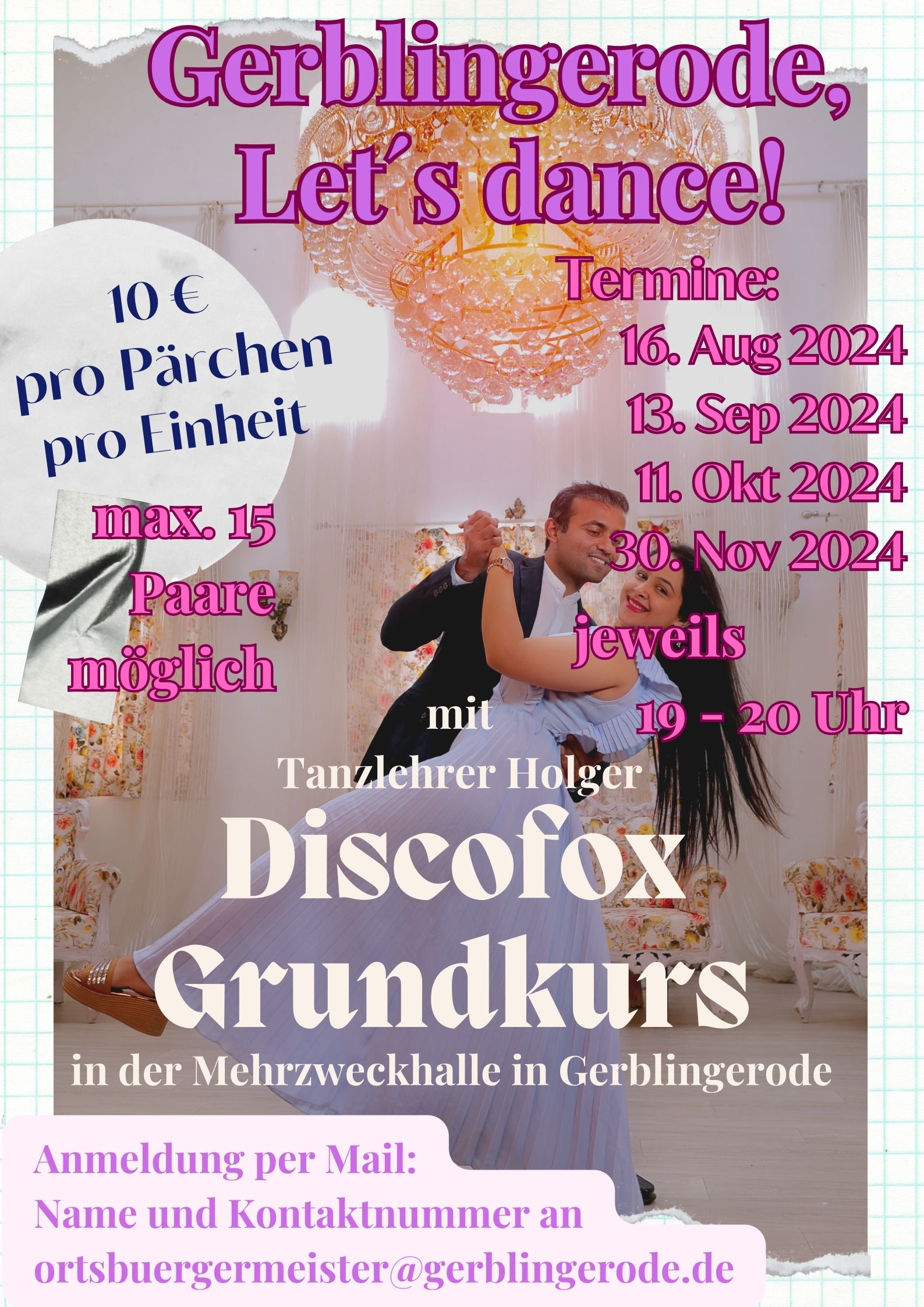Ortsbürgermeister veranstaltet zusammen mit Tanzlehrer Holger einen Discofox Grundkurs mit 4 Einheiten in der Mehrzweckhalle Gerblingerode. Bis max. 15 Pärchen können mitmachen. 10 € pro Pärchen pro Einheit als kleine Aufwandsentschädigung. Gerblingerode, Let´s dance!