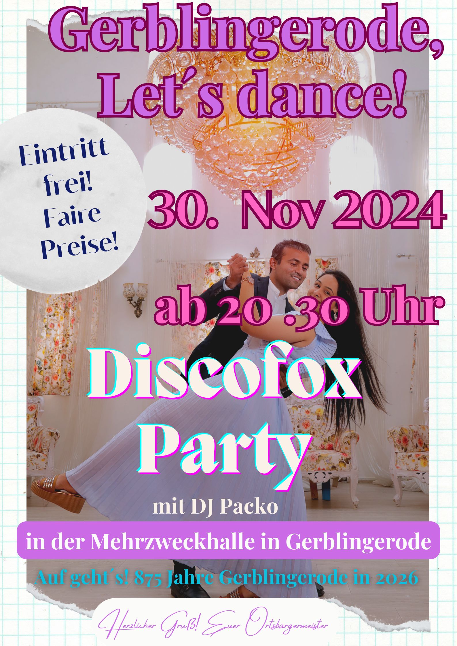 Nach dem Discofox-Tanzkurs steigt am 30.11.2024 ab 20.30 Uhr die Dicofox-Party für Alle, die Bock haben zu tanzen und zu feiern. Diesmal mit dabei: DJ Packo, der uns richtig einheizen wird mit allem, wozu man Discofox tanzen kann. Eintritt kostenlos und faire Preise! Gerblingerode, auf geht´s! 875 Jahre Gerblingerode in 2026. Der Reingewinn kommt wieder der Arge der Vereine & Verbände zugute!
