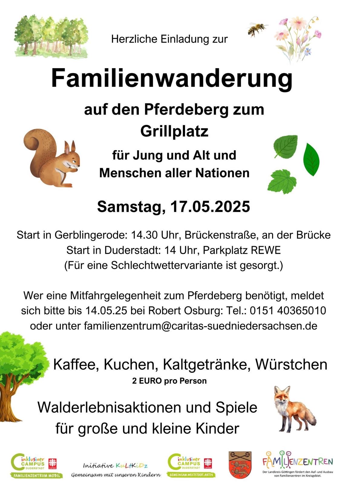 Das Familienzentrum Mobil der Caritas, der Ortsrat Gerblingerode mit dem Seniorenobmann und die Elterninitiative Kultkidz veranstalten gemeinsam eine Familenwanderung am Samstag, den 17.05.2025, zum Grillplatz auf den Pferdeberg. Neben Kaffee & Kuchen und Grillspezialitäten wird es Walderlebnisaktionen und Spiele für große und kleine Kinder geben.