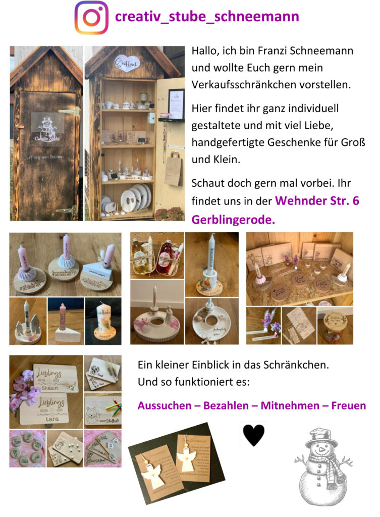 Franziska Schneemann bietet handgefertigte Bastelartikel an. Besuchen Sie doch einmal das Ausstellungsschränkchen in der Wehnder Str. 6.