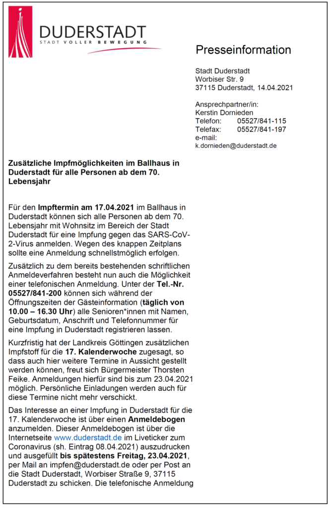 Presseinformation der Stadt Duderstadt – Zusätzliche Impfmöglichkeiten