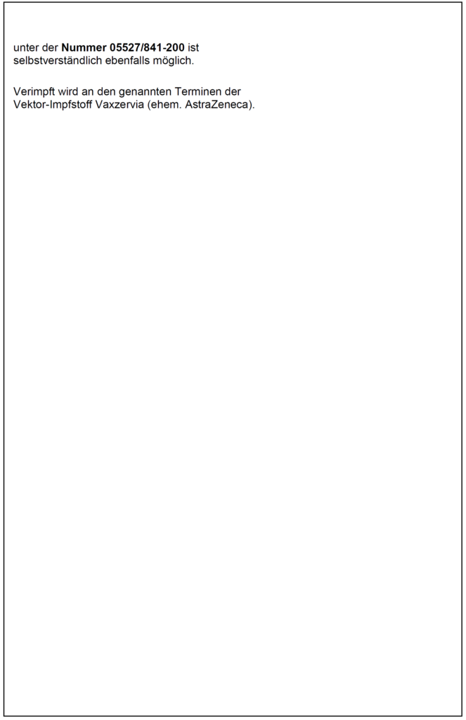 Bitte nutzen Sie diese zusätzliche Impfmöglichkeit, falls Sie sich impfen lassen möchten. Bleiben Sie gesund!