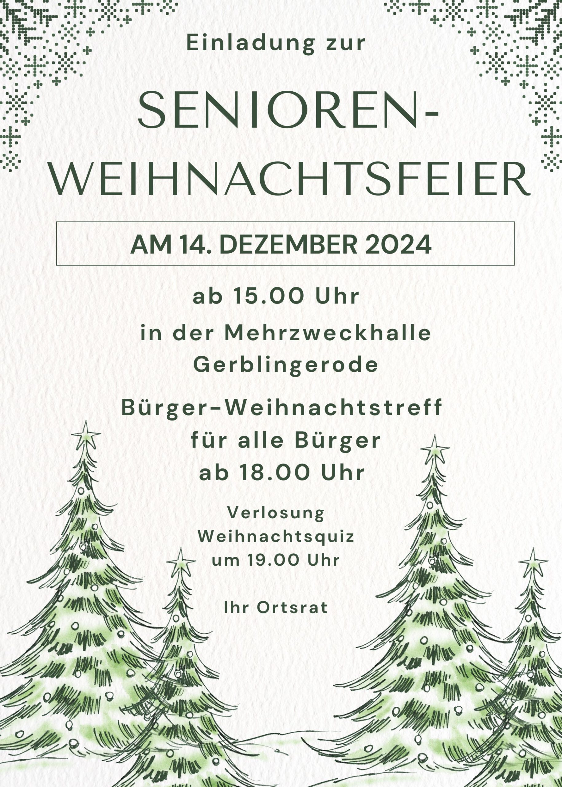 Der Ortsrat veranstaltet am 3. Adventssamstag die alljährige Senioren-Weihnachtsfeier ab 15.00 Uhr in der Mehrzweckhalle. Ab 18.00 Uhr sind alle Bürger zum Weihnachtstreff eingeladen. Neben Glühwein, Punsch und Bratwurst wird es auch wieder ein Weihnachtsquiz für Jung & Alt geben.