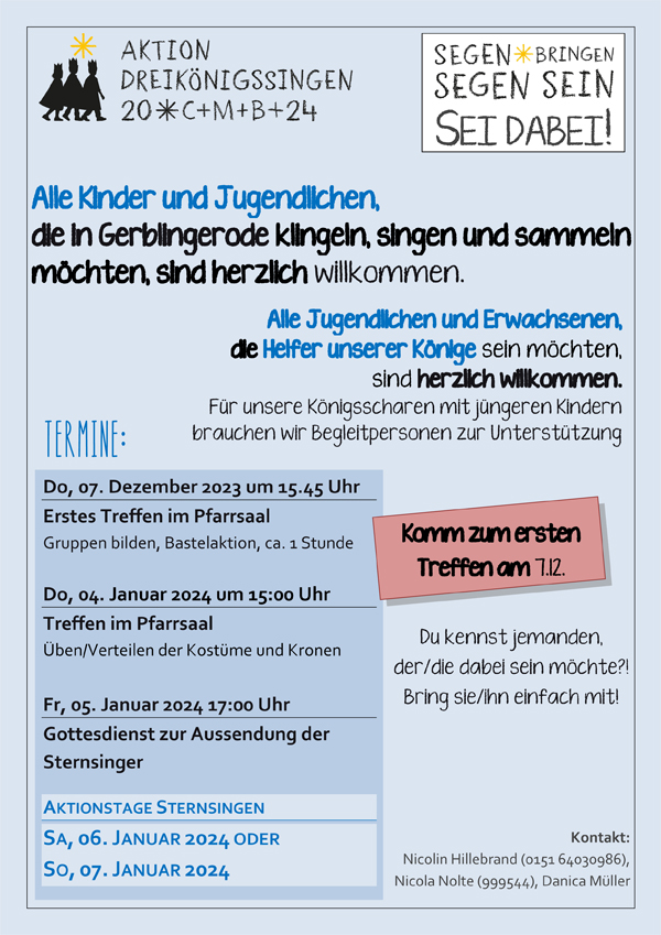 Alle Jugendlichen und Erwachsenen, die Helfer unserer Könige sein möchten, sind herzlich willkommen.