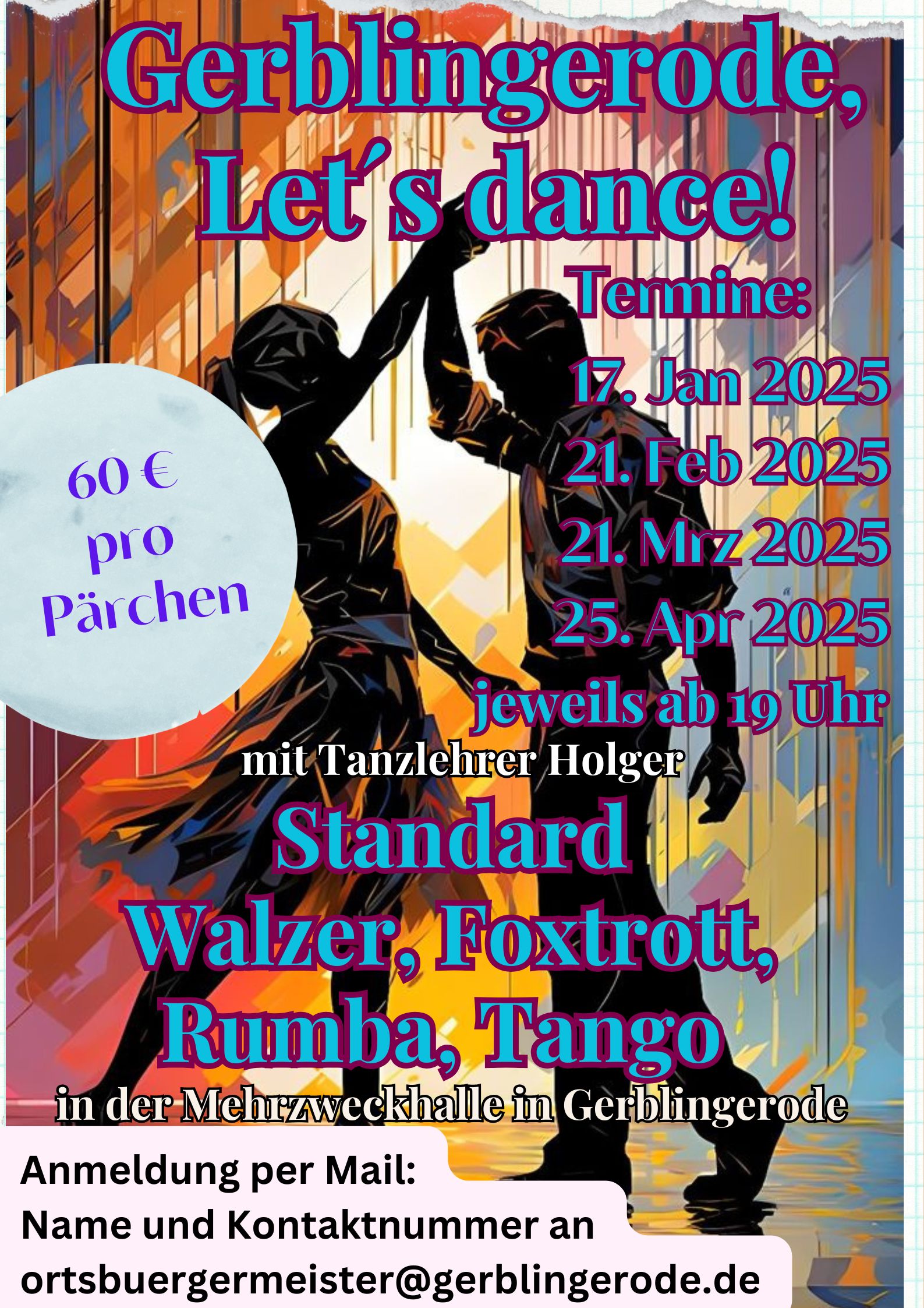 Anmeldung per Mail an ortsbuergermeister@gerblingerode.de. Vorrangig für Gerblingeröder Pärchen. Die ersten 20 Pärchen sind dabei!
