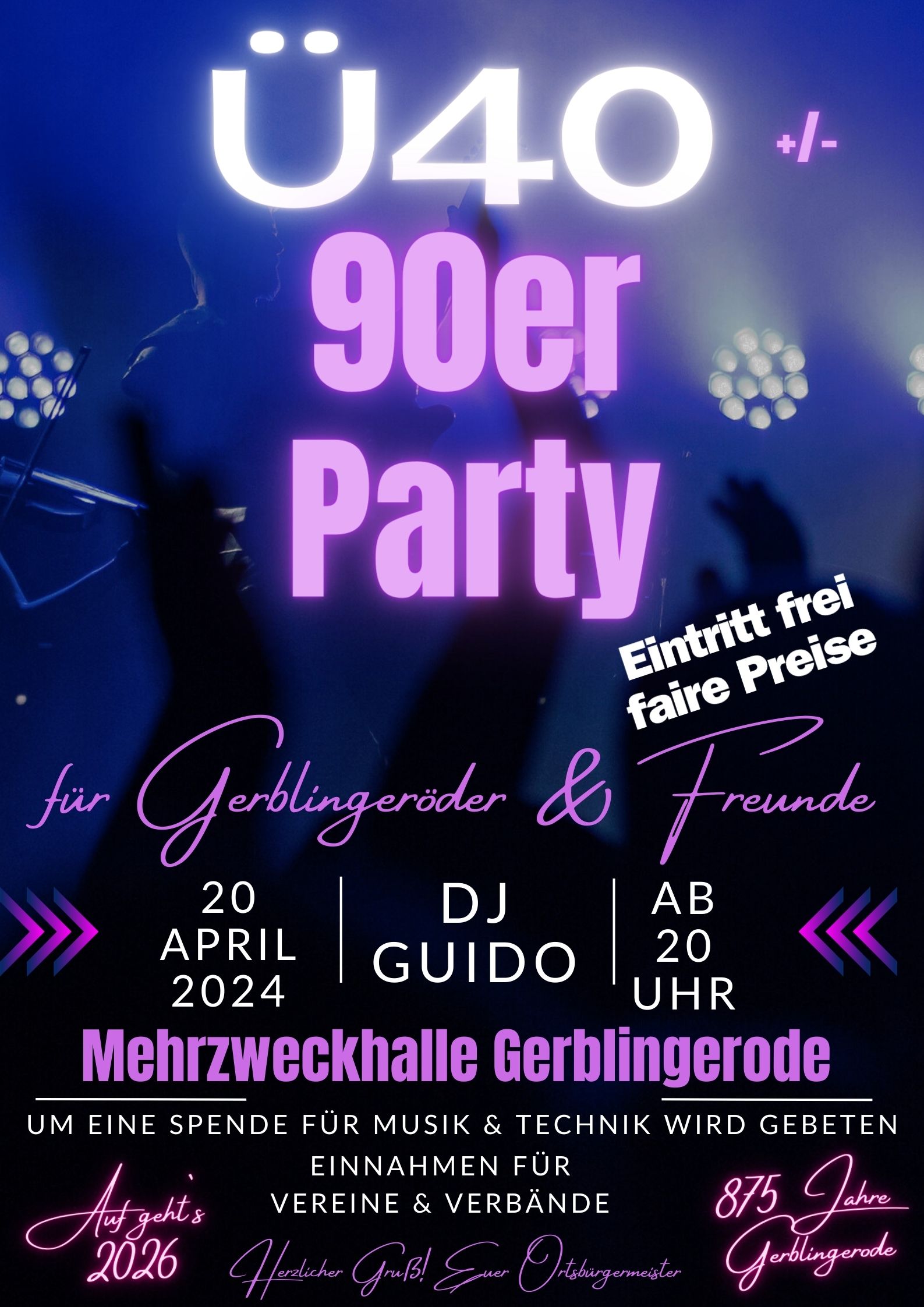 Auf geht´s 2026 – 875 Jahre Gerblingerode! Ortsbürgermeister veranstaltet zusammen mit DJ Guido Ü40-Discoparty für Gerblingeröder & Freunde, für die mittlere Generation 40+/-X, für die Junggeblienen und oder sich schon dazu Fühlenden. Der Erlös geht an die Arge der Vereine & Verbände.