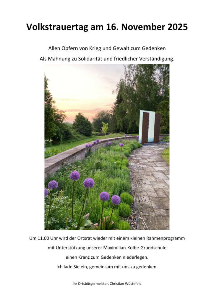 Am Volkstrauertag, Sonntag, den 16.11.2025, wird der Ortsrat um 11.00 Uhr mit musikalischer Unterstützung durch die Maximilian-Kolbe-Grundschule zum Gedenken aller Opfer von Krieg und Gewalt einen Kranz niederlegen.